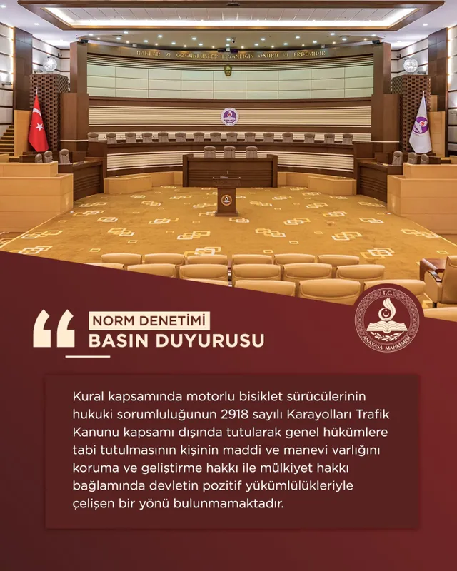 Anayasa Mahkemesi, 2918 sayılı Karayolları Trafik Kanunu’nda motorlu bisiklet sürücülerinin hukuki sorumluluğunun genel hükümlere tabi olduğunu öngören düzenlemenin Anayasa’ya aykırı olmadığına hükmetti.