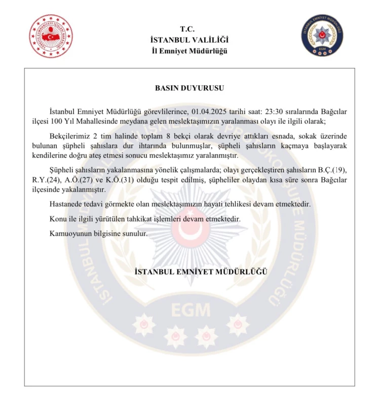 İstanbul Bağcılar İlçe Emniyet Müdürlüğü kadrosunda görevli Çarşı ve Mahalle Bekçisi Uğur Gölçek; dün durdurulan şüpheli şahısların silahlı saldırısı sonucu yaralanmış kaldırıldığı hastanede yapılan tüm müdahalelere rağmen kurtarılamayarak bugün… pic.twitter.com/Th689Zh4CV— Ali Yerlikaya (@AliYerlikaya) April 2, 2025