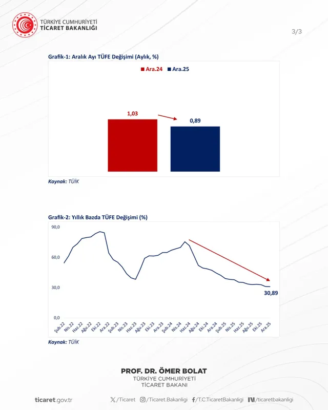 Ticaret Bakanı Ömer Bolat, Aralık 2025’te yıllık enflasyonun yüzde 30,89’a gerilediğini açıkladı. Bakan, düşüşün Türkiye ekonomisindeki toparlanma ve dezenflasyon sürecinin başarılı bir şekilde sürdüğünü gösterdiğini belirtti.