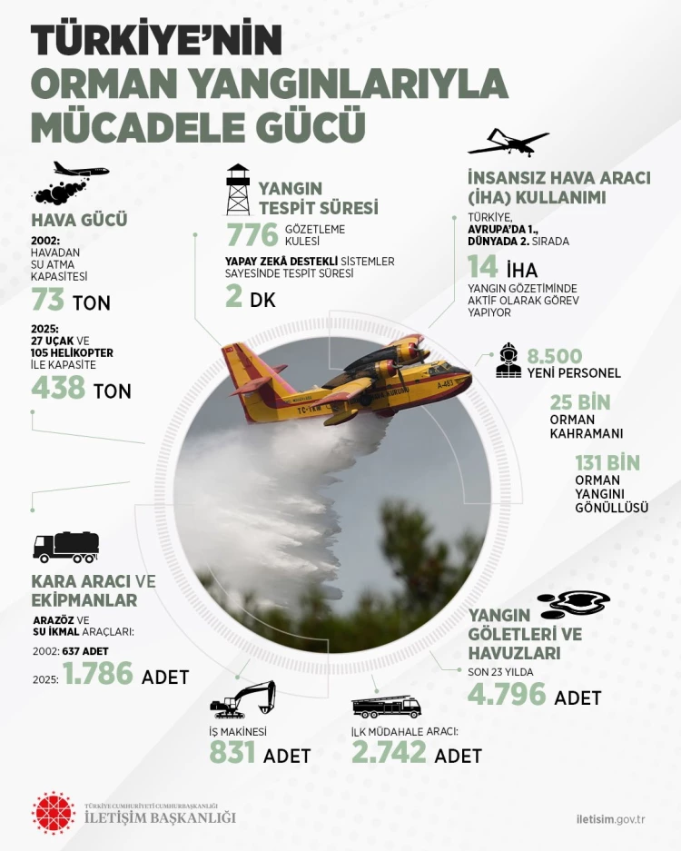 İletişim Başkanlığı'nın sosyal medya hesabından aktarılan bilgiye göre, Türkiye’nin Cumhuriyet tarihinin en güçlü hava, kara ve personel kapasitesine ulaştığını vurgulayan Bakan Yumaklı, “Yangınlarla mücadelede kullandığımız teknolojiyle dünyanın önde gelen ülkelerindeniz. Metotlarımızla ilgili birçok ülke bizimle iletişim halinde” dedi.