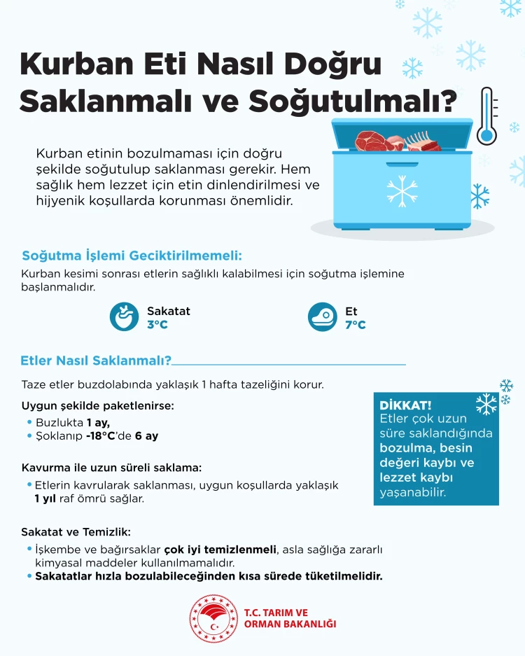Tarım ve Orman Bakanlığı, Kurban Bayramı’nda etin bozulmadan saklanması ve sağlıklı tüketilmesi için doğru soğutma ve saklama yöntemlerini içeren rehber yayımladı.