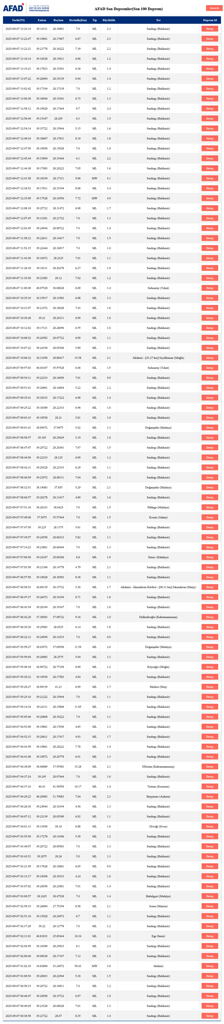 BURSA (İGFA) - Afet ve Acil Durum Yönetimi Başkanlığı (AFAD) verilerine göre, 7 Eylül 2025 tarihinde Balıkesir’in Sındırgı ilçesinde gün boyunca çok sayıda deprem kaydedildi.