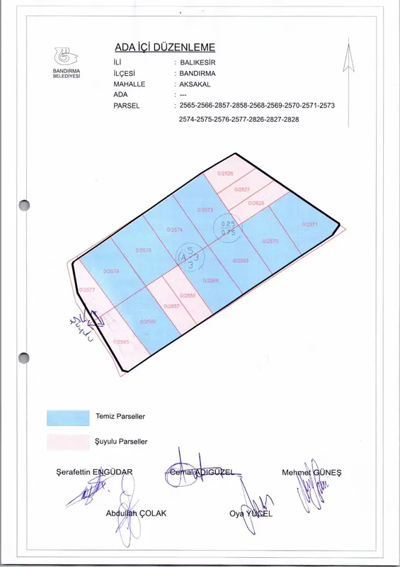 Bandırma Belediyesi Encümeni, 21 Ocak 2026 tarihli ve 66 sayılı kararı ile Aksakal Mahallesi'nde bulunan 2565, 2566, 2857, 2858, 2568, 2569, 2570, 2571, 2573, 2574, 2575, 2576, 2577, 2826, 2827 ve 2828 numaralı parsellere ait ada içi düzenleme planının onaylanmasına karar verdi.