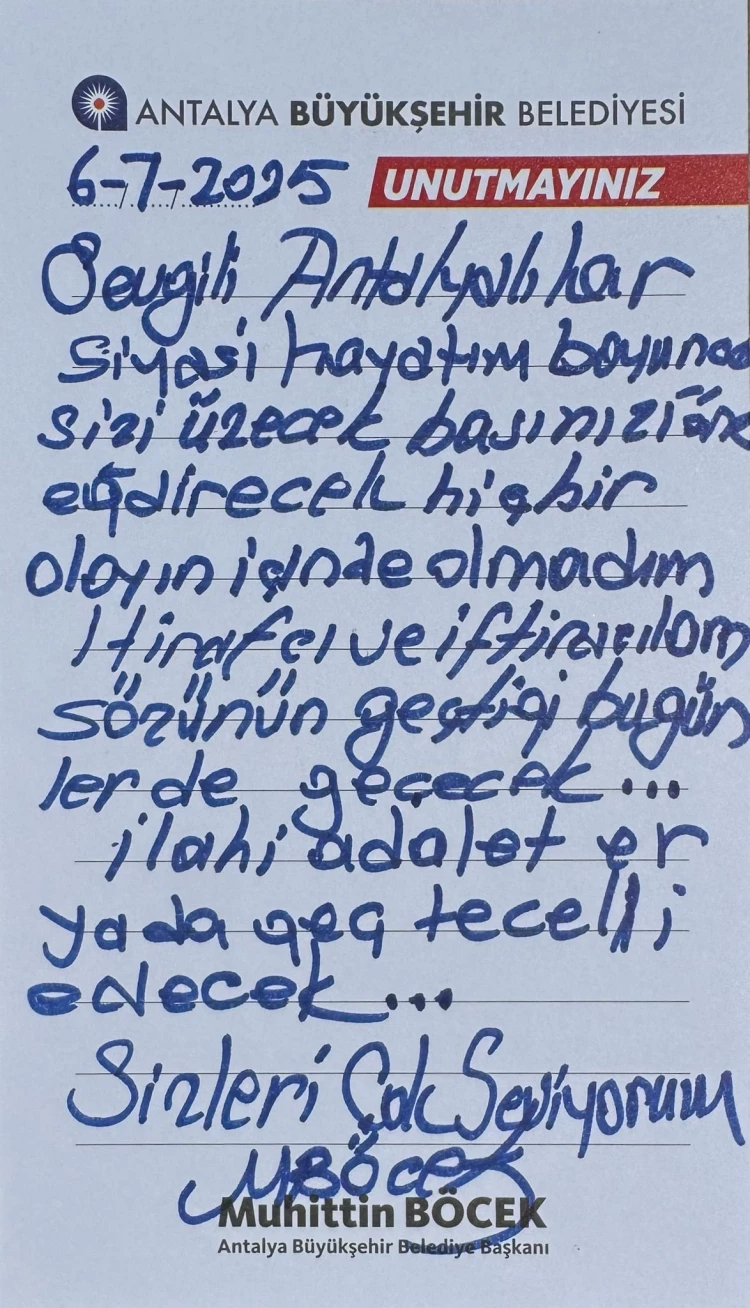 Antalya Büyükşehir Belediye Başkanı Muhittin Böcek, sosyal medya üzerinden Antalyalılara seslenerek, “Siyasi hayatım boyunca sizi üzecek hiçbir olayın içinde olmadım. İtirafçı ve iftiracıların sözünün geçtiği günler de geçecek” dedi.