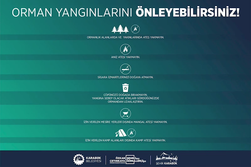 Belediye Başkanımız Özkan Çetinkaya, yaz aylarında artan sıcaklıklarla birlikte yükselen orman yangını riskine karşı vatandaşları duyarlı olmaya davet etti. Özellikle ormanlık ve mesire alanlarında ateş yakma, sigara izmariti bırakma, cam şişe atma gibi dikkatsiz davranışların büyük tehlike oluşturduğunu vurgulayan Çetinkaya; "Ormanlarımız sadece Karabük’ün değil, ülkemizin ortak değeridir. Hepimiz sorumlulukla hareket etmeliyiz" dedi.