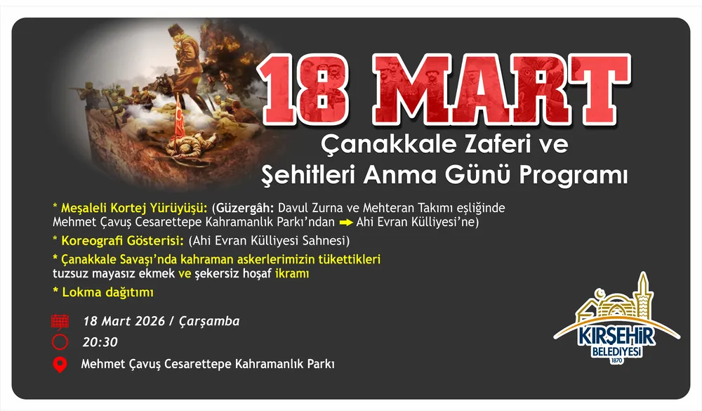 Çanakkale Zaferi ve Şehitleri Anma Günü kapsamında, 18 Mart 2026 Çarşamba günü saat 20.30’da Mehmet Çavuş Cesarettepe Kahramanlık Parkı’nda Kırşehir Belediyesi tarafından bir program gerçekleştirilecek.