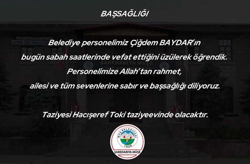 Belediye personelimiz Çiğdem BAYDAR’ın bugün sabah saatlerinde vefat ettiğini üzülerek öğrendik. Personelimize Allah’tan rahmet, ailesi ve tüm sevenlerine sabır ve başsağlığı diliyoruz.