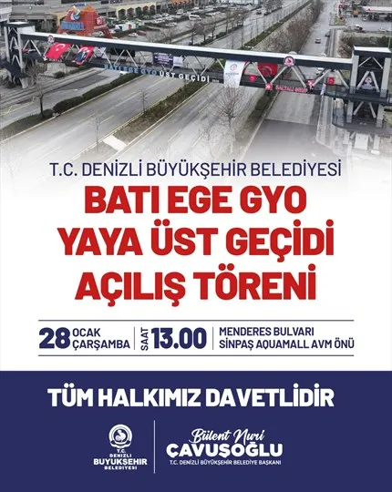 Denizli Büyükşehir Belediyesi ile Baltalı Grup arasında imzalanan protokol kapsamında, Menderes Bulvarı üzerinde Sinpaş Aquamall AVM önüne inşa edilen modern üst geçit, 28 Ocak Çarşamba günü saat 13.00'te düzenlenecek törenle hizmete açılacak.