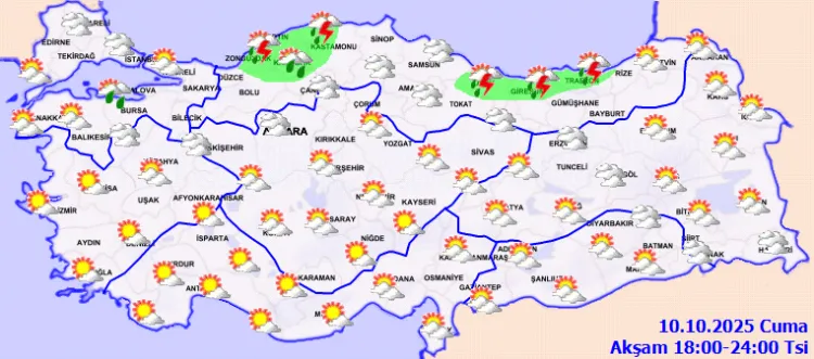 Meteoroloji Genel Müdürlüğü tarafından yapılan tahminlere göre, yurdun genelinin parçalı yer yer çok bulutlu, Batı Karadeniz(Bolu hariç), Orta ve Doğu kıyıları ile Sakarya'nın kıyı kesimleri, Artvin ve Ardahan çevrelerinin sağanak ve yer yer gök gürültülü sağanak yağışlı geçeceği tahmin ediliyor. Yağışların, Düzce'nin kıyı kesimleri ile Zonguldak ve Bartın çevrelerinde yerel kuvvetli olması bekleniyor.
