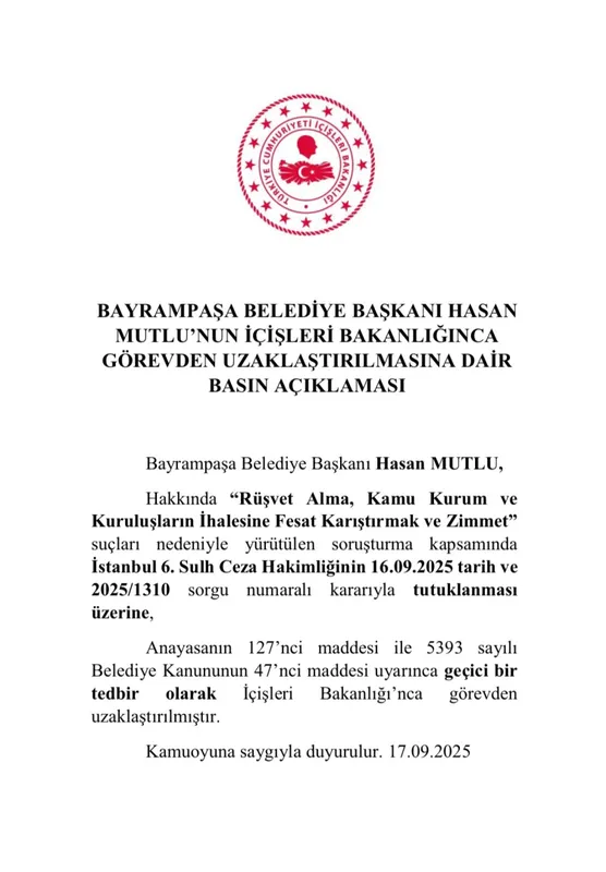 İçişleri Bakanlığı, rüşvet alma, kamu kurum ve kuruluşların ihalesine fesat karıştırma ve zimmet suçlamalarıyla yürütülen soruşturma kapsamında tutuklanan Bayrampaşa Belediye Başkanı Hasan Mutlu'yu görevden uzaklaştırdı.