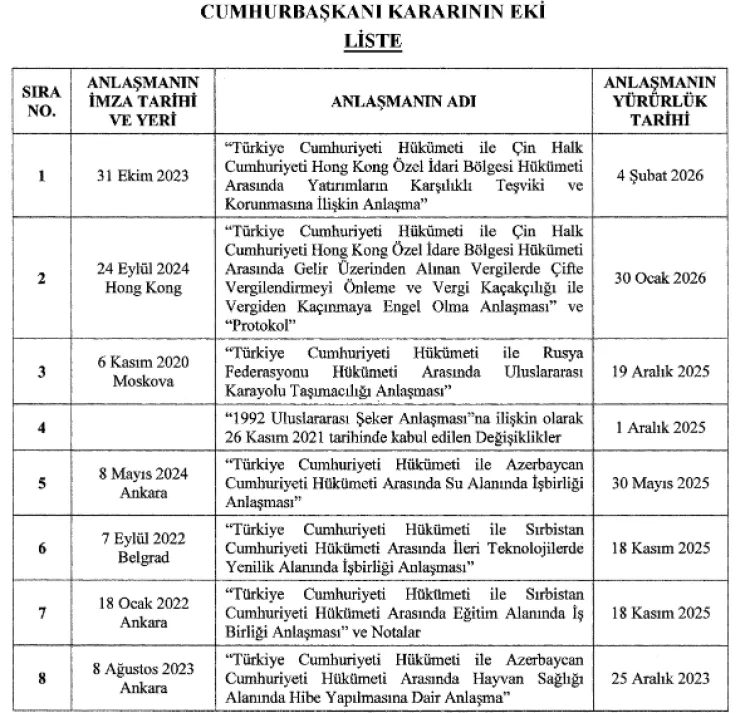 9 sayılı Cumhurbaşkanlığı Kararnamesi'nin ilgili maddeleri uyarınca hazırlanan karara göre 8 ayrı uluslararası anlaşmaların imza yeri, tarihi ve yürürlüğe giriş tarihleri duyuruldu.