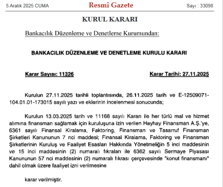 Bankacılık Düzenleme ve Denetleme Kurulu (BDDK), 27 Kasım 2025 tarihli 11326 sayılı kararıyla Hayhay Finansman A.Ş.'ye faaliyet izni verdi. Resmi Gazete'de yayımlanan karar, şirketin konut finansmanı dahil her türlü mal ve hizmet alımı için kredi sağlayabilmesini resmileştirdi. Finans sektörüne yeni bir oyuncu eklendi.