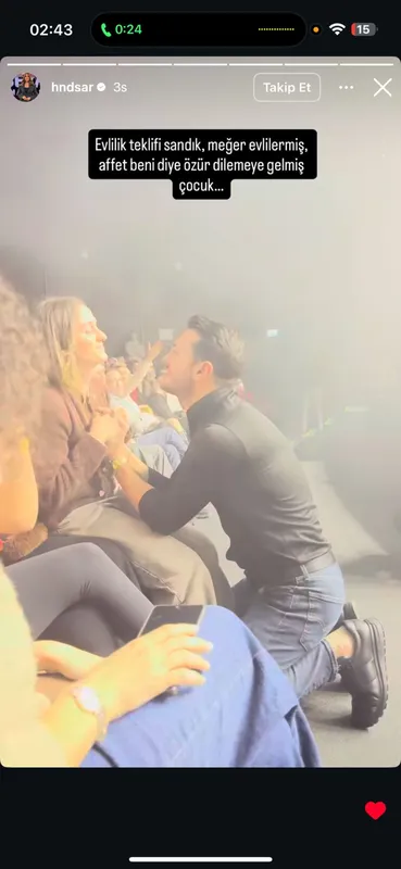 Bu anları konser izleyenler arasında olan ünlü haber spikeri Hande Sarıoğlu sosyal medyasından ‘Evlilik teklifi sandık, meğer evlilermiş, affet beni diye özür dilemeye gelmiş çocuk...’ notuyla paylaştı.