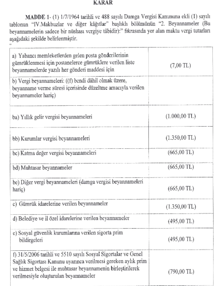 ANKARA (İGFA) - Cumhurbaşkanı Kararları ile Damga Vergisi Kanunu’na ekli (1) sayılı tabloda yer alan bazı kâğıtların maktu vergi tutarları yeniden belirlendi.