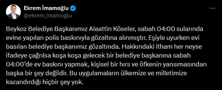 Gözaltı işlemi sonrasında İstanbul Büyükşehir Belediye Başkanı Ekrem İmamoğlu da sosyal medya hesabı üzerinden paylaşımda bulundu.