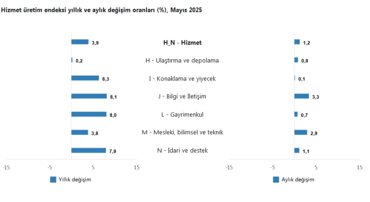 Türkiye’de Hizmet Üretim Endeksi, 2025 Mayıs’ta bir önceki yıla göre yüzde 3,9, bir önceki aya göre yüzde 1,2 artış gösterdi. Bilgi ve iletişim hizmetleri ile gayrimenkul hizmetleri en yüksek yıllık artışı kaydetti.