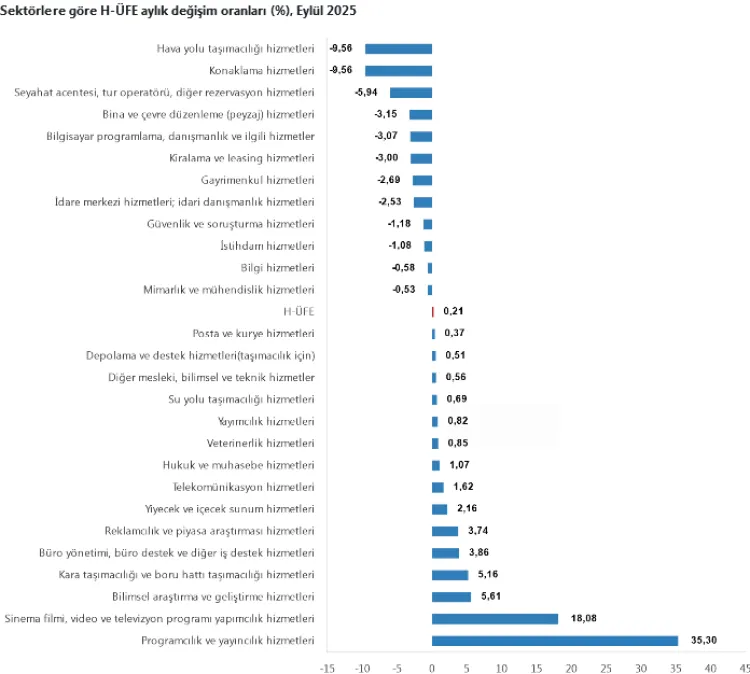 Türkiye İstatistik Kurumu (TÜİK), 2025 yılı Eylül ayı Hizmet Üretici Fiyat Endeksi (H-ÜFE) sonuçlarını açıkladı. H-ÜFE Eylül'de yıllık yüzde 34,91 artık. Yıllık değişimde en çok değişim bilimsel araştırma ve geliştirme hizmetlerinde olurken, aylık bazda en çok değişim programcılık ve yayıncılık hizmetlerinde oldu.