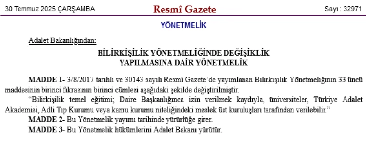 Yapılan değişiklikle, bilirkişilik temel eğitimi artık sadece Daire Başkanlığı’nın izniyle sınırlı olmak kaydıyla; üniversiteler, Türkiye Adalet Akademisi, Adli Tıp Kurumu, Kamu kurumu niteliğindeki meslek üst kuruluşları tarafından verilebilecek.