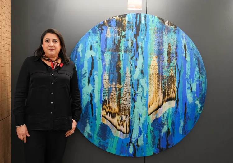 Yasemen Latife Ayvaz, lirik soyutlamalarıyla kent, insan ve kültür arasında çok katmanlı bir bağ kuruyor. Renk kullanımındaki ustalığı serginin öne çıkan unsurlarından biri.