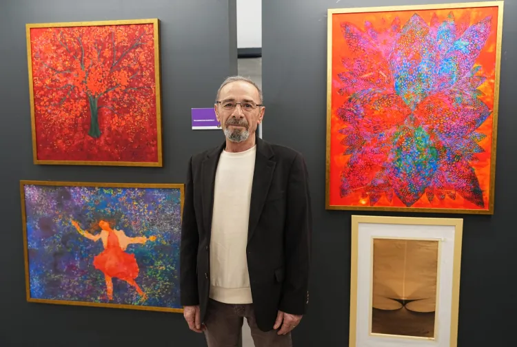 Serginin genç isimlerinden Melisa Özgür, geometrik soyutlama ve kozmik motifleri buluşturan kompozisyonlarıyla dikkat çekiyor. Katmanlı yüzeyler ve güçlü renk enerjisi, izleyiciye yeni bir görsel deneyim sunuyor.