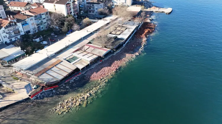 Eski beton kalıntılarının temizlendiği sahilde yoğun bir çalışma yürüten Büyükşehir ekipleri, fore kazık makinesinin çalışabilmesi için platform zemin oluşturdu. Yapılacak zemin iyileştirme çalışmalarından sonra bölgeye yürüyüş yolu da inşa edilecek.