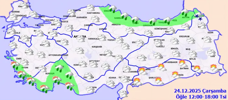 ANKARA (İGFA) - Meteoroloji Genel Müdürlüğü, 24 Aralık Çarşamba gününe ilişkin hava tahmin raporunu yayımladı.
