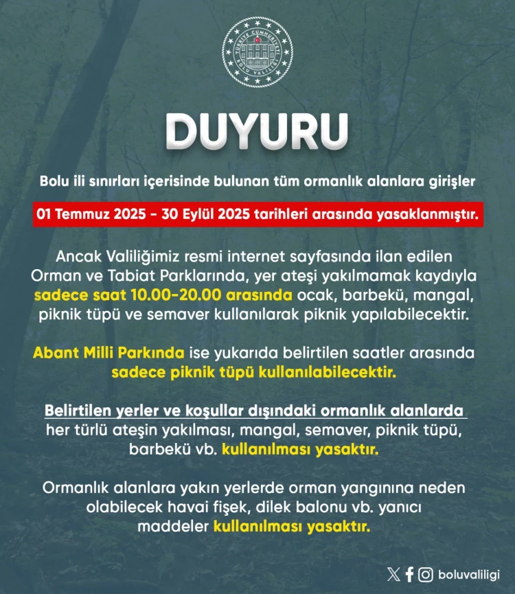 Bolu Valiliği, il genelinde orman yangınlarını önlemek için 1 Temmuz-30 Eylül 2025 tarihleri arasında ormanlık alanlara girişleri yasakladı. Valilik, ateş yakmayı ve piknik faaliyetlerini de sıkı kurallara bağladı.