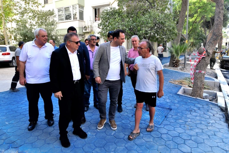 İZMİR (İGFA) - Mavi renkli kaldırımları ve baskı asfaltıyla dikkat çeken sokakta incelemelerde bulunan Bornova Belediye Başkanı Ömer Eşki, CHP Genel Başkan Yardımcısı Gökan Zeybek ile birlikte çalışmaları yerinde gördü.