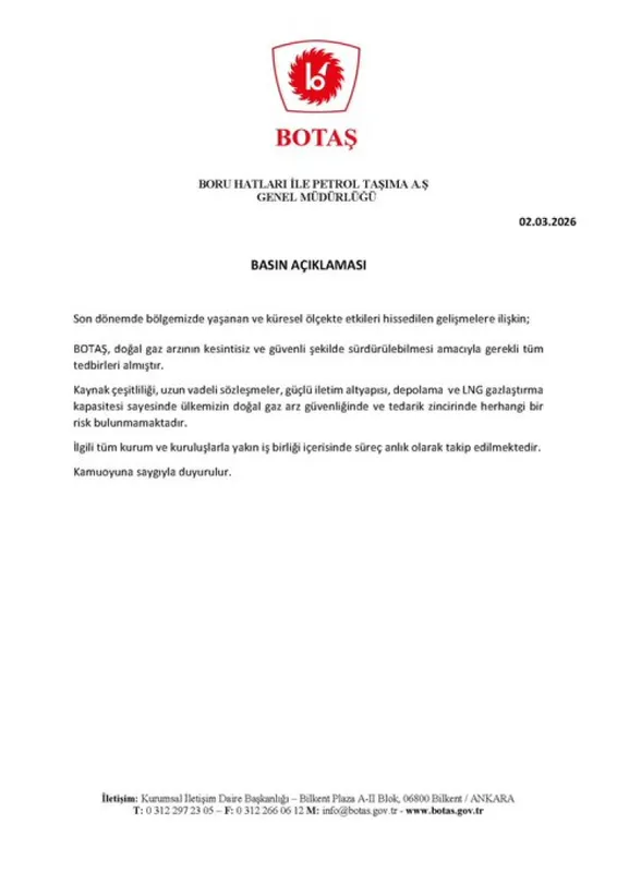 BOTAŞ'tan yapılan yazılı açıkalmada, doğal gaz arzının kesintisiz ve güvenli şekilde sürdürülebilmesi amacıyla gerekli tüm tedbirlerin alındığının altı çizilirken, kaynak çeşitliliği, uzun vadeli sözleşmeler, güçlü iletim altyapısı, depolama ve LNG gazlaştırma kapasitesi sayesinde ülkemizin doğal gaz arz güvenliğinde herhangi bir risk bulunmadığı vurgulandı.