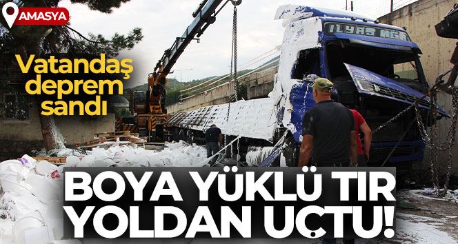 Amasya’da yolda kontrolden çıkan boya malzemesi yüklü tır yaklaşık 5 metreden aşağı uçtu. Kaza anında çıkan gürültüyü deprem sanan vatandaşlar büyük panik yaşadı.