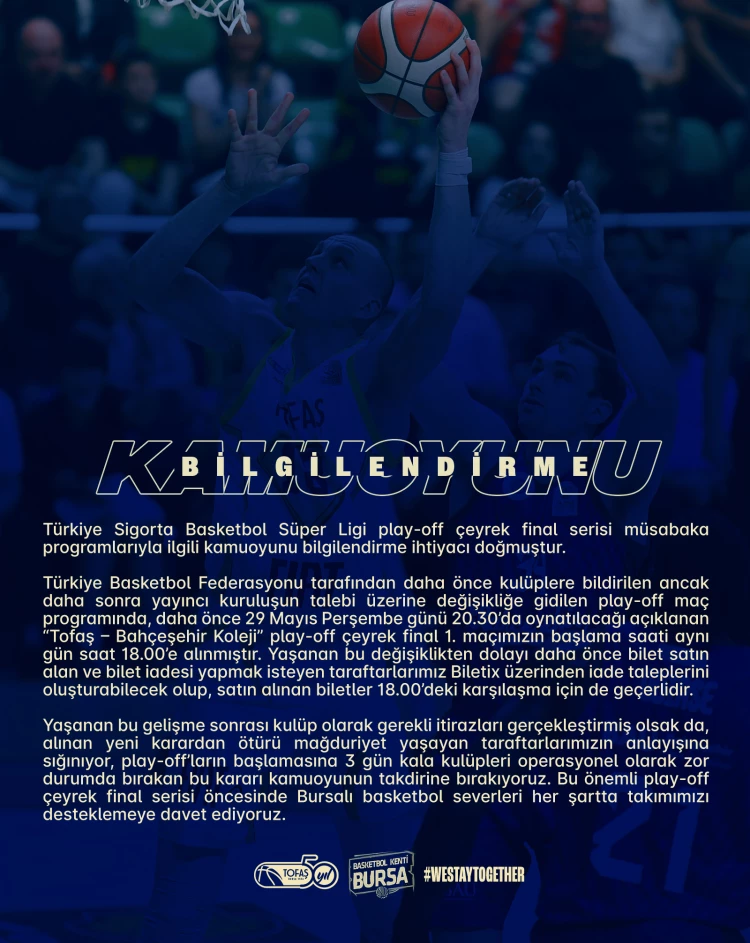 BURSA (İGFA) - Türkiye Basketbol Federasyonu tarafından daha önce kulüplere bildirilen ancak daha sonra yayıncı kuruluşun talebi üzerine değişikliğe gidilen play-off maç programında, daha önce 29 Mayıs Perşembe günü 20.30’da oynatılacağı açıklamada “Tofaş – Bahçeşehir Koleji” play-off çeyrek final 1. maçımızın başlama saati aynı gün saat 18.00’e alınmıştır. Yaşanan bu değişiklikten dolayı daha önce bilet satın alan ve bilet iadesi yapmak isteyen taraftarlarımız Biletix üzerinden (aşağıdaki linkten) iade taleplerini oluşturabilecek olup, satın alınan biletler 18.00’deki karşılaşma için de geçerlidir.