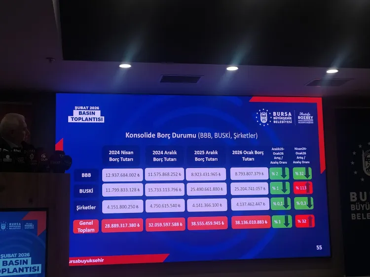 Bursa Büyükşehir Belediyesi'nin borçlarında son bir ayda yüzde 2, Nisan 2024’ten bu yana ise yüzde 32’lik düşüş sağlandığını kaydeden Başkan Bozbey, bağlı şirketlerde de benzer bir tablo olduğunu söyledi. Ancak BUSKİ’de, Aralık 2025–Ocak 2026 arasında borçlarda binde 1 civarında değişim görüldüğünü, göreve geldiklerinden bugüne kadar ise yüzde 113 oranında artış olduğunu ifade etti.