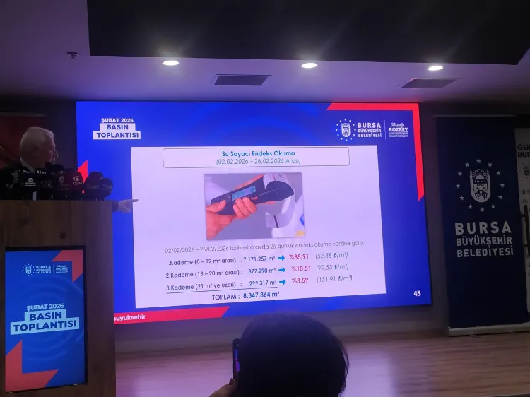 Bursa’daki baraj doluluk oranlarına da dikkati çeken Başkan Bozbey; Doğancı Barajı'nde yüzde 56, Nilüfer Barajı'nda yüzde 78,52, Çınarcık Barajı'nda yüzde 79,23, Ortalama doluluk oranının ise yüzde 67,3 olduğunu duyurdu. Bozbey, 2024 Şubat sonu doluluk oranının yüzde 92 iken 2025’te yüzde 35, 2026’da ise yüzde 66 seviyesinde olduğunu anımsatarak, vatandaşları su tasarrufuna çağırdı.