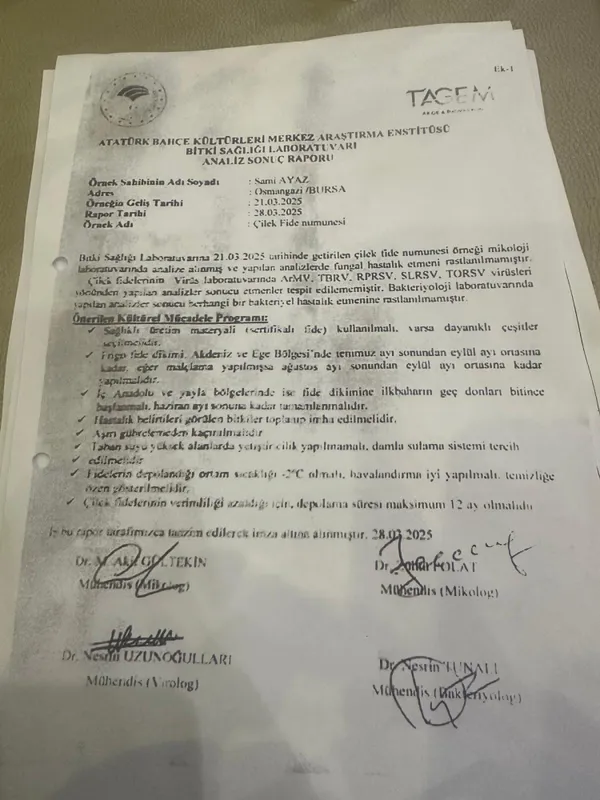 Analiz sonuçlarına göre alınan fidelerin mantar hastalığı taşıdığı, temiz gösterilmesine rağmen belgelerde oynama yapıldığı saptandı.