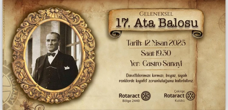 BURSA (İGFA) - Bursa Çekirge Rotaract Kulübü’nün geleneksel etkinliği “Ata Balosu”, bu yıl 17’ncisiyle 12 Nisan 2025 Cumartesi günü saat 19.30’da Nilüfer Organize Sanayi Bölgesi’ndeki Gastro Sanayi’de gerçekleştirilecek. Gazi Mustafa Kemal Atatürk’ü anma gecesinin onur konuğu Müstafi Tümamiral Doç. Dr. Cihat Yaycı olacak.