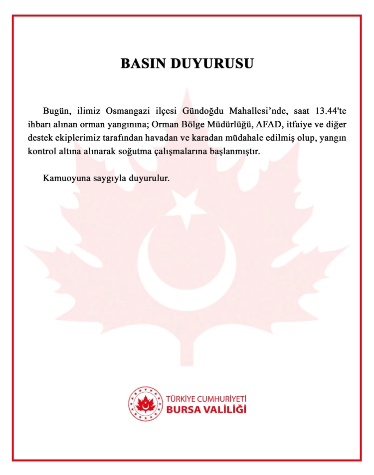 Bursa Osmangazi Gündoğdu Mahallesi'nde başlayan orman yangını, ekiplerin hızlı müdahalesiyle kontrol altına alındı. Yangına 3 uçak, 11 helikopter, 37 arazöz ve 242 personel müdahale edildi. Bölgede soğutma çalışmaları sürüyor.