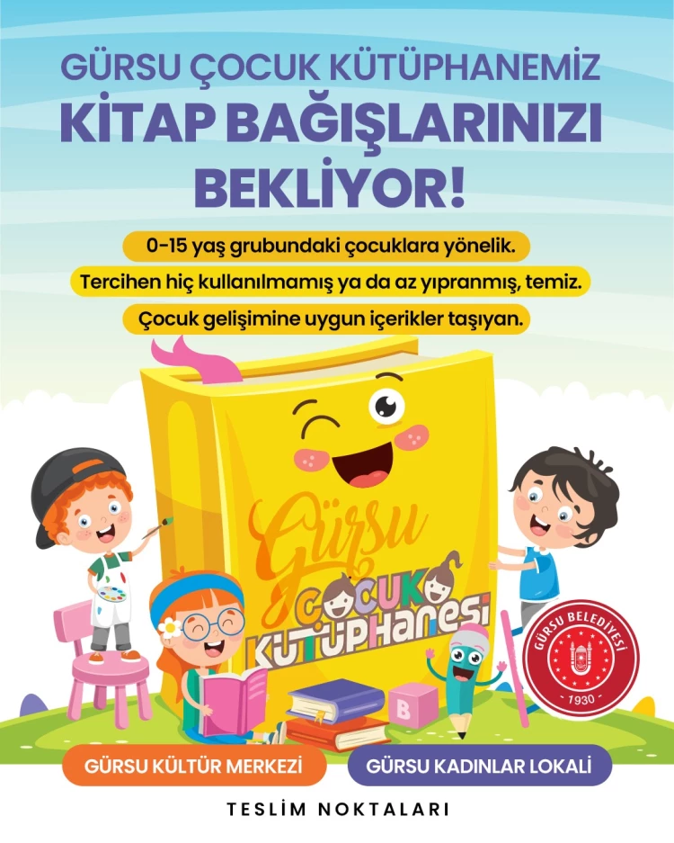 Bursa Gürsu Belediyesi 23 Nisan Çocuk Bayramı’nda hizmete almayı planladığı Çocuk Kütüphanesi projesi için kitap kampanyası başlattı. Toplumsal duyarlılık oluşturma ve gelecek nesillere en güzel miras bırakma konusunda farkındalık sağlamak isteyen Gürsu Belediyesi, bu sayede ortak bir kültür hareketi başlattı.