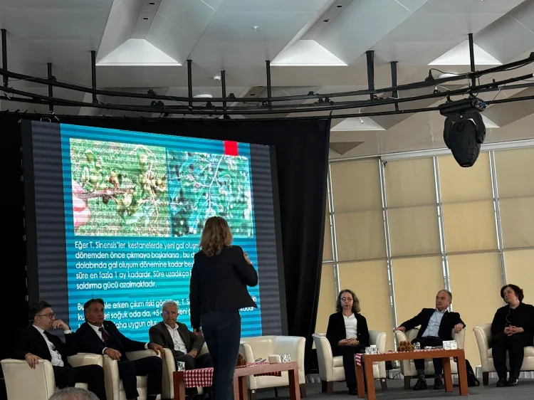 İlk oturumda Uludağ Üniversitesi Ziraat Fakültesi Bahçe Bitkileri Bölümü Öğretim Üyesi Cevriye Mert, Uludağ Üniversitesi Ziraat Fakültesi Bitki Koruma Bölümü Emekli Öğretim Üyesi Doç. Dr. Himmet Tezcan, Bursa İl Tarım Müdürlüğü’nden Kıymet Senan Savaş, Bursa Kent Konseyi Başkanı Ertuğrul Aksoy, Orman Bölge Müdürlüğü’nden Orman Yüksek Mühendisi Özden Açıcı ve Üretici Ertuğrul Sünel, kestane türleri, üretimin en çok olduğu yerler, kestane hastalıkları, kestanelerde zarar yapak böcek türleri gibi konularla kestaneyi her yönüyle ele alarak üreticilere sunum gerçekleştirdi.