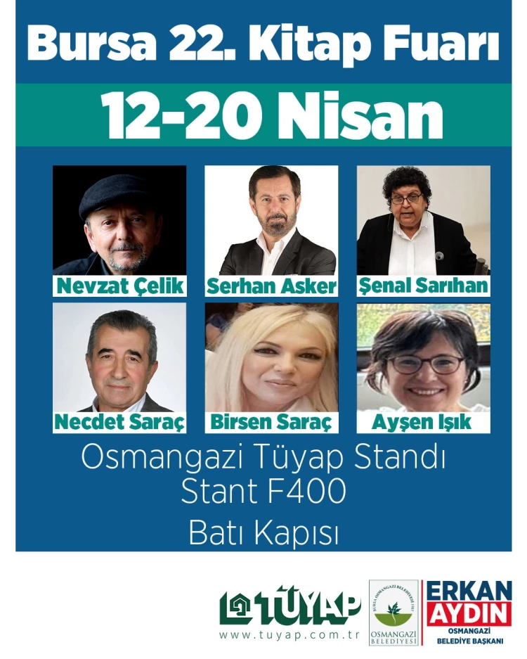 12 Nisan Cumartesi saat 13.00 Nevzat Çelik, 13 Nisan Pazar saat 15.00 Serhan Asker, 14 Nisan Pazartesi saat 17.00 Ayşen Işık, 16 Nisan Çarşamba saat 14.00 Şenal Sarıhan, 18 Nisan Cuma saat 15.00’ta ise Necdet Saraç ve Birsen Saraç, sevenleriyle Osmangazi Belediyesi’nin standında bir arada olacak.