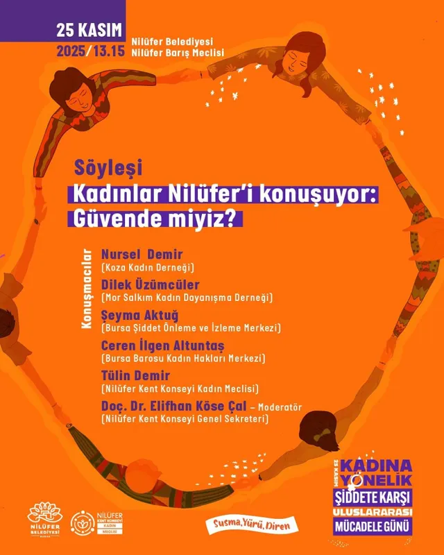 Etkinlikler kapsamında Nilüfer Barış Meclisi’nde “Kadınlar Nilüfer’i konuşuyor: Güvende miyiz?” söyleşisi düzenlenecek. Söyleşi, alanında uzman isimleri ve sivil toplum kuruluşu temsilcilerini bir araya getirecek.