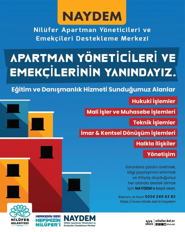 Bursa'da Nilüfer Belediyesi, Türkiye’de bir ilke imza atarak apartman, site ve iş merkezi yöneticileri ile bu alanlarda çalışan emekçiler için özel bir destek merkezi kurdu. Nilüfer Apartman Yöneticileri ve Emekçileri Destekleme Merkezi (NAYDEM) adıyla hizmet verecek merkez, yöneticilerin karşılaştığı sorunlara çözüm üretecek.