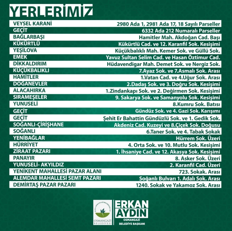 Osmangazi Belediyesi, Kurban Bayramı süresince kurbanlıkların temiz ve hijyenik koşullarda satış ve kesim işlemlerinin yapılabilmesi için gerekli tedbirleri aldı. Vatandaşların kurbanlarını dini hükümlere, sağlık şartlarına ve çevre temizliğine uygun olarak kesmelerini sağlamak adına ilçedeki 23 kapalı ve açık pazar yeri kurban kesim alanı olarak düzenlendi. Bağlarbaşı, Kükürtlü, Yeşilova, Emek, Dikkaldırım, Küçükbalıklı, Hamitler, Doğanevler, Alacahırka, Sırameşeler, Yunuseli Geçit (Gündüz Sok), Geçit (1. Gediz Sok.), Soğanlı-Çirişhane, Soğanlı, Yenibağlar, Hürriyet, Ziraat Pazarı, Panayır, Yunuseli-Akyıldız, Yenikent, Alemdar, Demirtaş mahallelerinde bulunan kapalı ve açık pazar yerlerinin yanı sıra Geçit Mahallesi’nde kurulan kurban satış noktası ile Veysel Karani Modern Kurban Satış ve Kesim Tesisi de kurban kesim noktası olarak belirlendi.