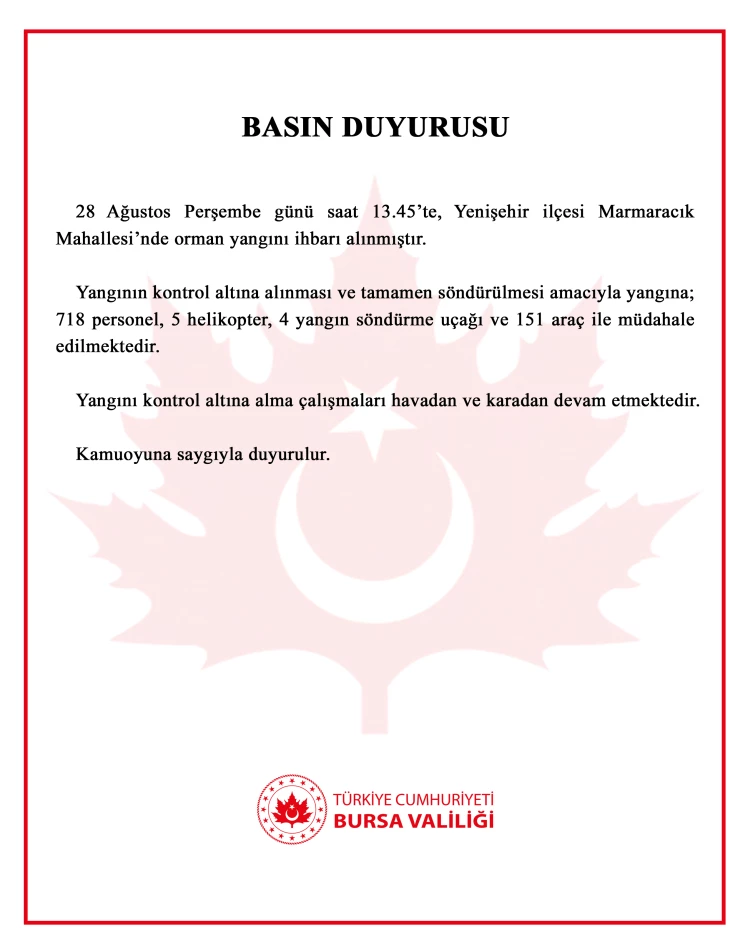 Bursa’nın Yenişehir ilçesi Marmaracık Mahallesi’nde çıkan orman yangınına, 718 personel, 5 helikopter, 4 yangın söndürme uçağı ve 151 araçla müdahale ediliyor. Bursa Valiliği, yangını kontrol altına alma çalışmalarının havadan ve karadan devam ettiğini duyurdu.