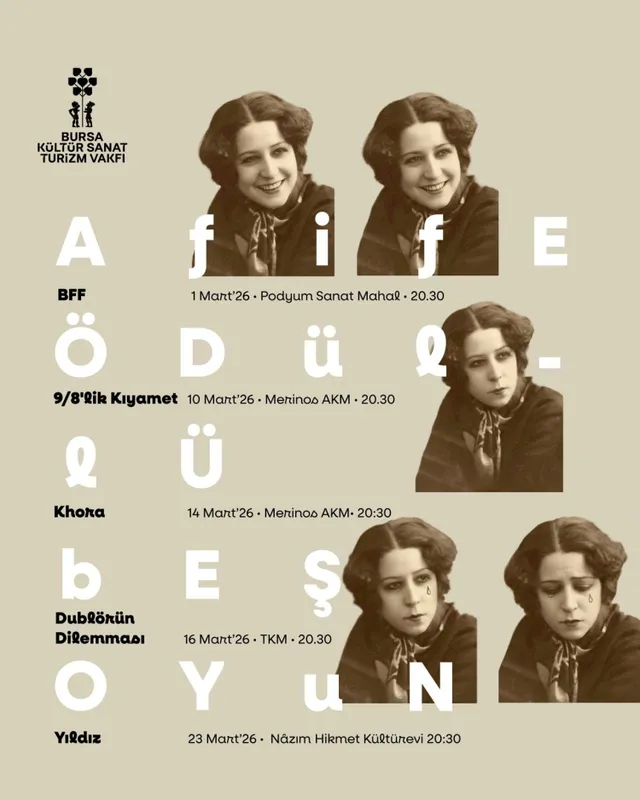 BURSA (İGFA) - Bursa Büyükşehir Belediyesi ev sahipliğinde, Bursa Kültür Sanat ve Turizm Vakfı (BKSTV) tarafından hazırlanan ‘Afife Tiyatro Günleri’, Mart ayı boyunca Afife Tiyatro Ödülleri’ne layık görülen 5 seçkin oyunu Bursalı sanatseverlerle buluşturuyor. 27 Mart Dünya Tiyatro Günü çerçevesinde gerçekleştirilen özel seçkide, çağdaş, nitelikli ve etkileyici sahne yapımları izleyici karşısına çıkacak.