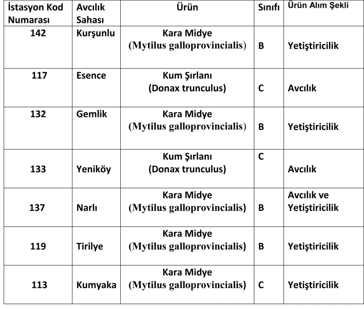 BURSA (İGFA) - Bursa İl Tarım ve Orman Müdürlüğü, “Avcılık ve Yetiştiricilik Yoluyla Elde Edilen Çift Kabuklu Yumuşakça Üretim Alanlarının Belirlenmesi, Sınıflandırılması, Ürün Alımına Açılıp Kapatılması ve Numune Alımına İlişkin Uygulama Talimatı” kapsamında, Bursa sınırlarında avcılığa açık kum şırlanı (Donax trunculus) ve kara midye (Mytilus galloprovincialis) izleme alanlarına ait koordinat ve istasyon bilgilerini kamuoyuyla paylaştı.