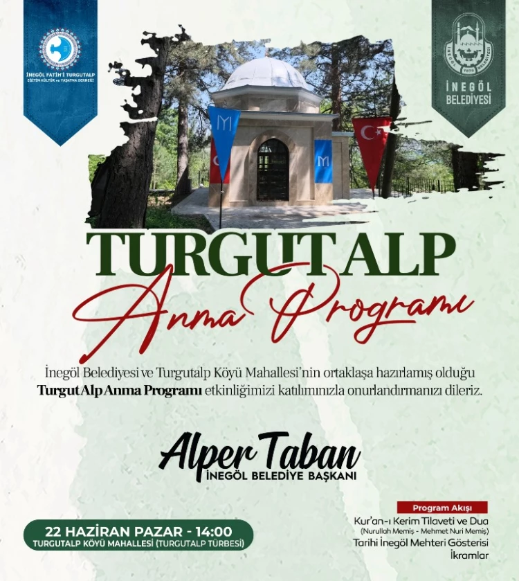 Bursa'da İnegöl Belediyesi ile Turgutalp Köy Mahallesi’nin iş birliğiyle, Osmanlı’nın kuruluş döneminin önemli isimlerinden ve İnegöl’ün Fatihi Turgut Alp için 22 Haziran Pazar günü saat 14.00’te Turgut Alp Türbesi’nde anma programı düzenlenecek.