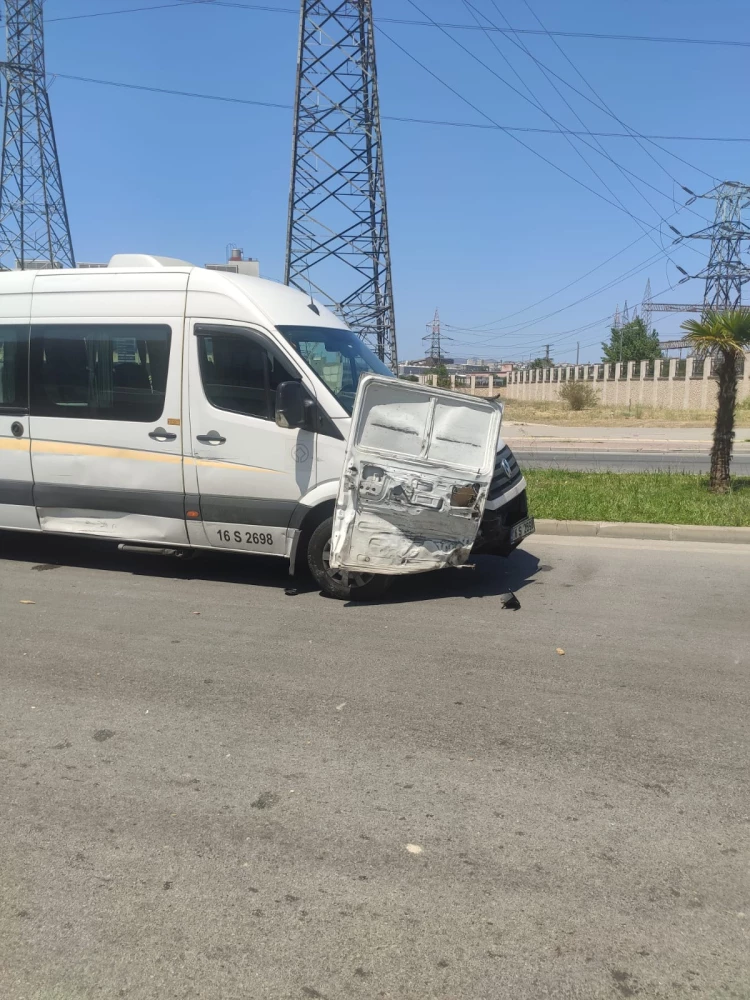Bursa’da 16 S 2698 plakalı servis minibüsü ile damacana su taşıyan minibüsün çarpıştığı kazada yaralanan olmazken, damacana minibüsünün kapısının servis aracına sıkışması gülümseten anlara sahne oldu.