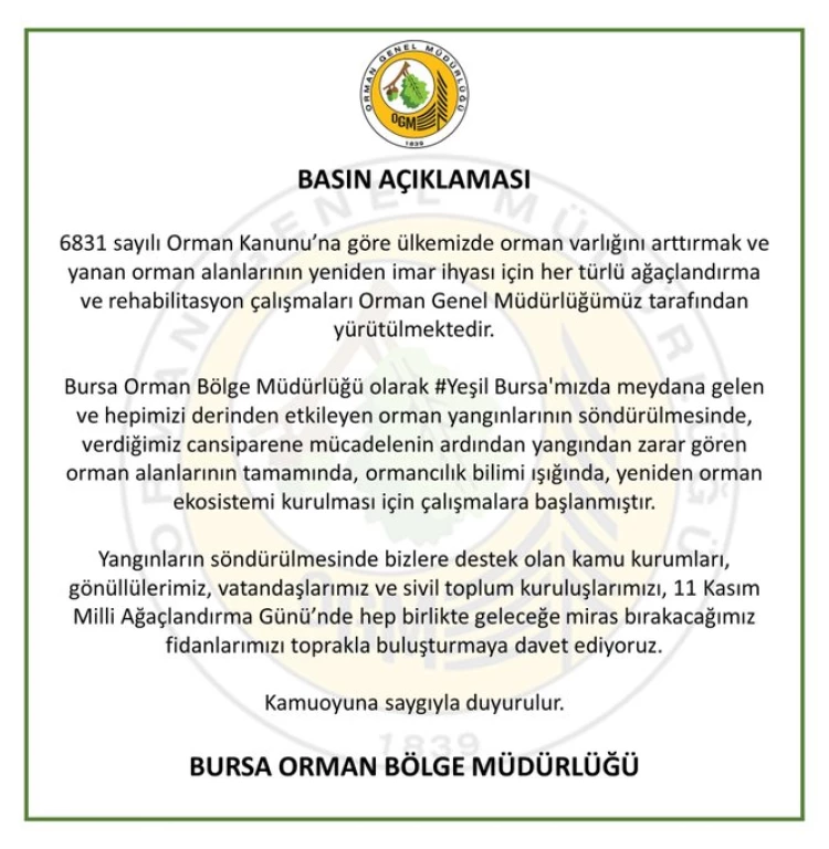 Bursa Orman Bölge Müdürlüğü, yangınlardan zarar gören orman alanlarında ağaçlandırma ve rehabilitasyon çalışmalarına başladığını duyurarak, söndürme çalışmalarına destek veren herkesi, 11 Kasım Milli Ağaçlandırma Günü’nde fidan dikimine davet etti.