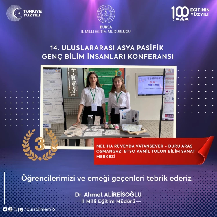 Bursa Osmangazi BTSO Kamil Tolon Bilim ve Sanat Merkezi öğrencileri Meliha Rüveyda Vatansever ve Duru Aras, 23-27 Temmuz 2025’te Tayvan’da düzenlenen 14. Uluslararası Asya Pasifik Genç Bilim İnsanları Konferansı’nda (APYS) Çevre Bilimleri kategorisinde dünya üçüncülüğü elde etti.