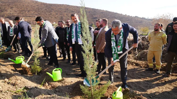 BURSA (İGFA) - Bursaspor Kulübü Başkanı Enes Çelik, Teknik Direktör Tahsin Tam, Gürsu Belediye Başkanı Mustafa Işık ile beraber yeşil beyazlı futbolcular ile Uludağ Organize Sanayi yönetici ve iş insanları, Karahıdır ve İğdir bölgesinde yanan ormanlık alanlarda fidan dikimi gerçekleştirdi.